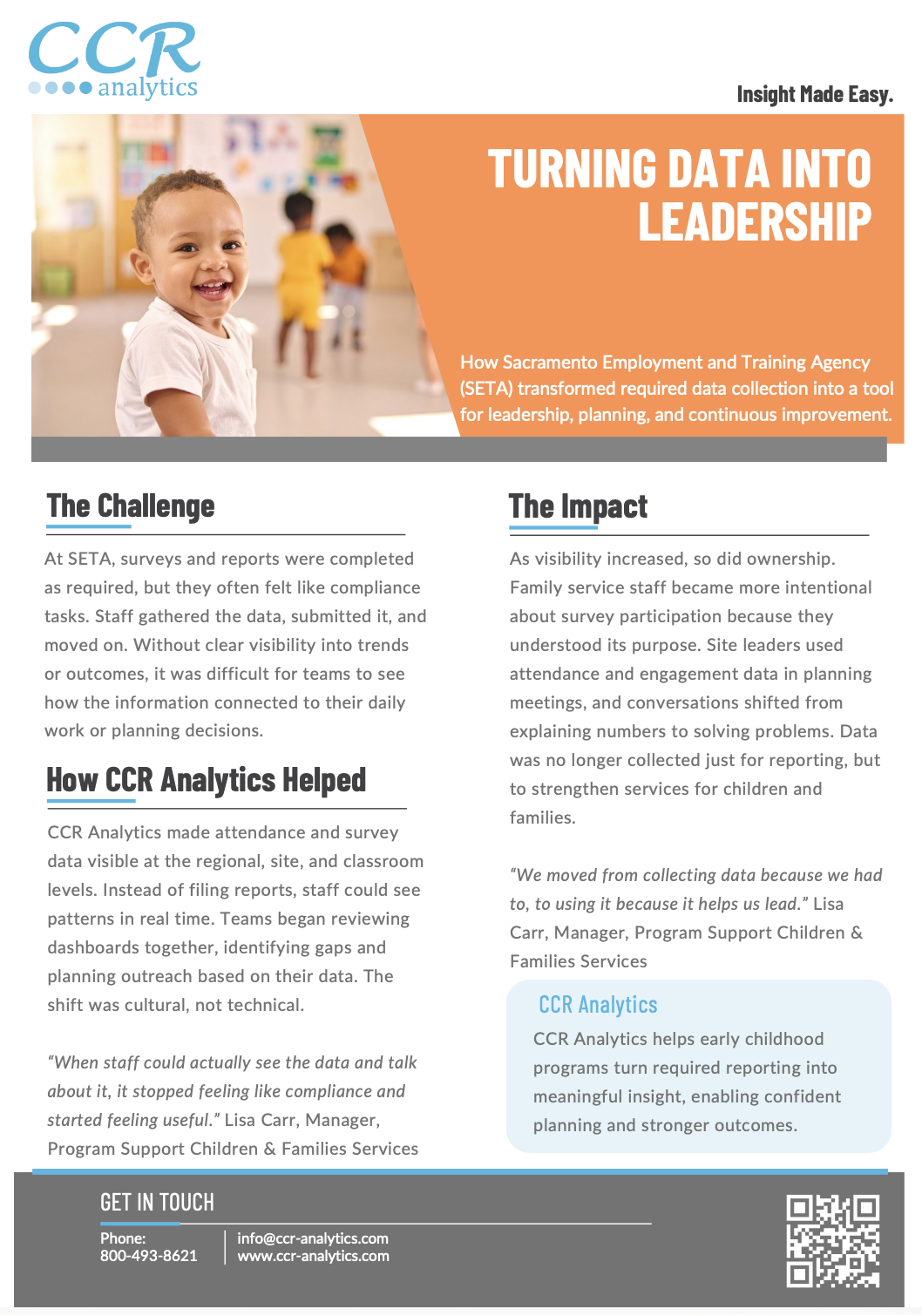 The turning data into leadership case study explores how SETA used CCR Analytics dashboards to transform required data collection into a tool for leadership, planning, and continuous improvement.